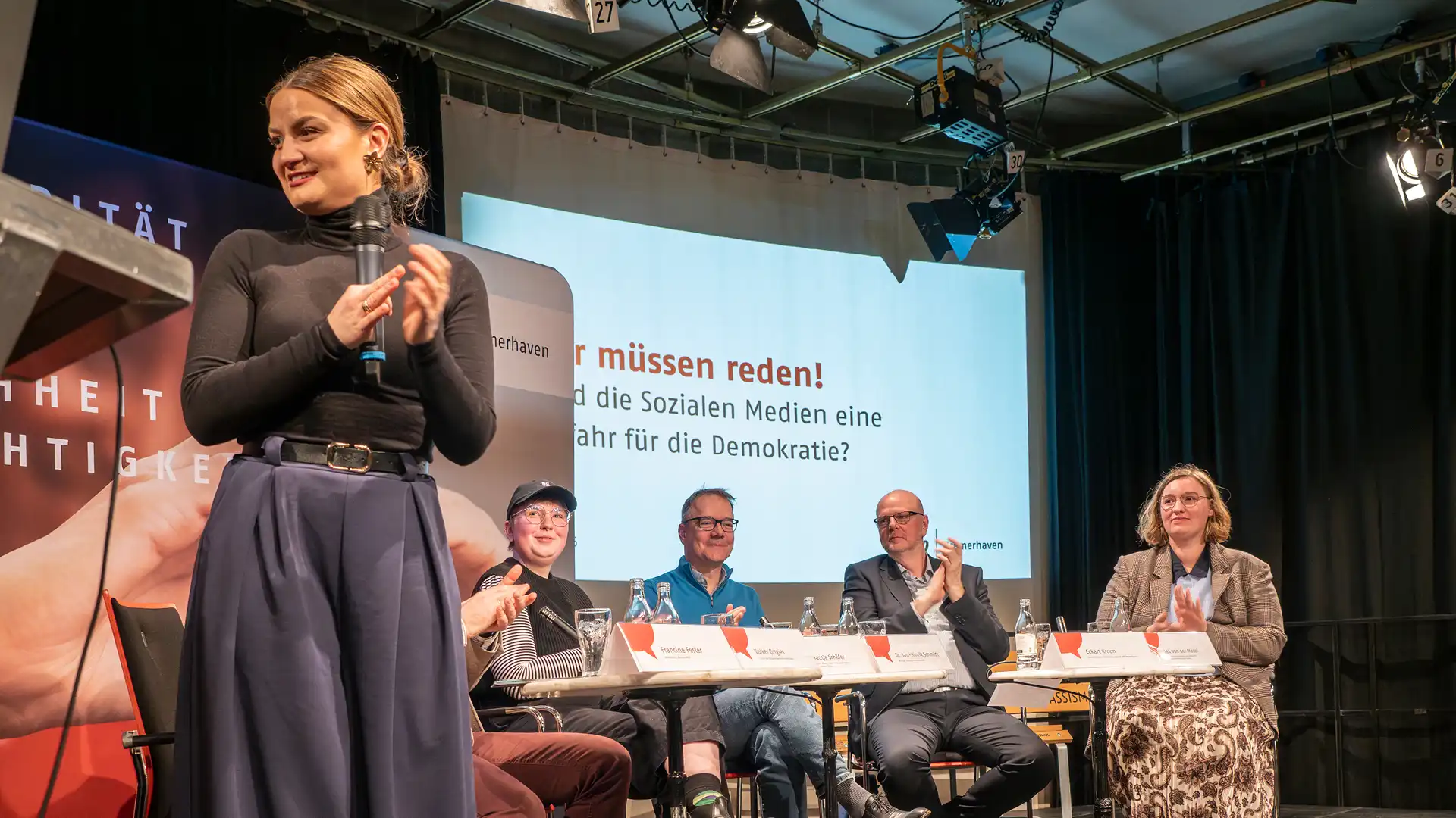 Swantje Schäfer, Student*in und politische Aktivistin, betonte, wie wichtig es für die Persönlichkeitsbildung von jungen Menschen sei, sich auszuprobieren, sich verschiedenen Gruppen anzuschließen und vielleicht auch verschiedene Netz-Identitäten auszuleben: „Es herrscht schon auch Verunsicherung bei jungen Leuten: Was kann ich posten, wo kann ich aktiv sein, welche Auswirkungen hat das auf Bewerbungen für einen neuen Job?“ Lea von der Mosel, Referentin für Öffentlichkeitsarbeit und Social Media bei der Arbeitnehmerkammer, mahnte Differenzierung in der Bewertung der sozialen Netze an: „In Karriere- und Berufsnetzwerken herrscht selbst bei sehr konträren Auffassungen und Meinungen ja eine viel zivilisiertere Debattenkultur als bei Facebook oder X.“